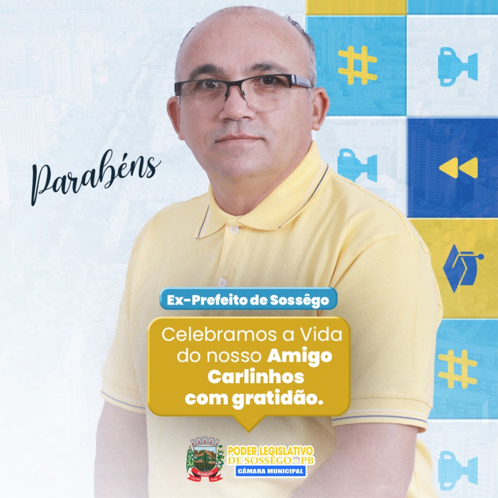 A Câmara Municipal de Sossego parabeniza o ex-prefeito Carlinhos por mais um ano de vida! Seu compromisso e dedicação ao nosso município sempre serão lembrados com respeito e gratidão
