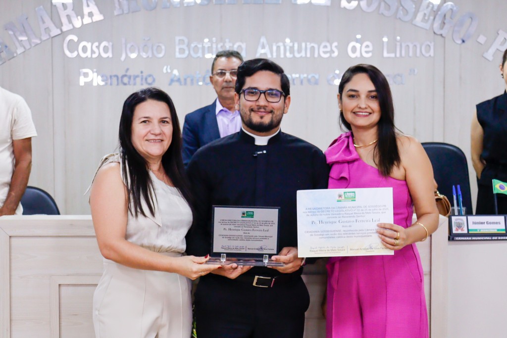 Na manhã desta sexta-feira, 25 de julho, a Câmara Municipal de Sossêgo viveu um momento histórico com a Sessão Solene de Entrega de Comenda e do Título de Cidadão Sosseguense ao Reverendo Pe. Henrique Gustavo Ferreira Leal.